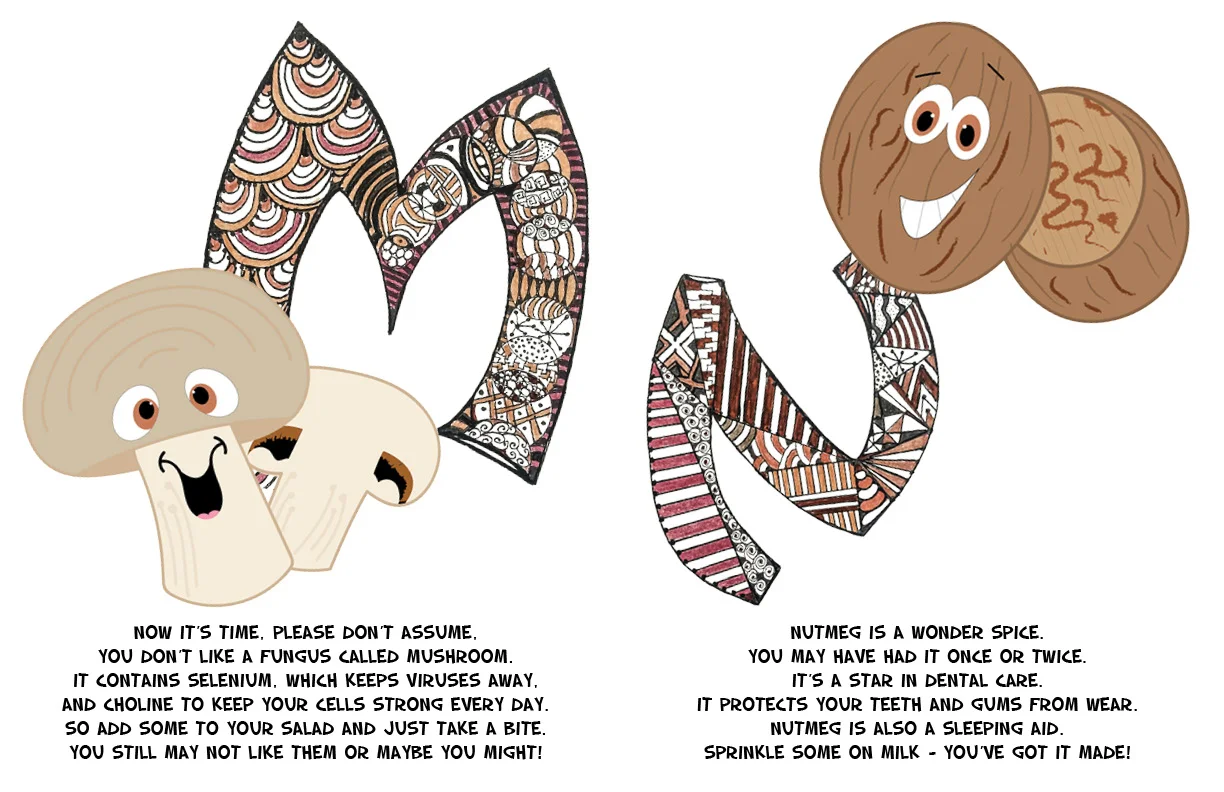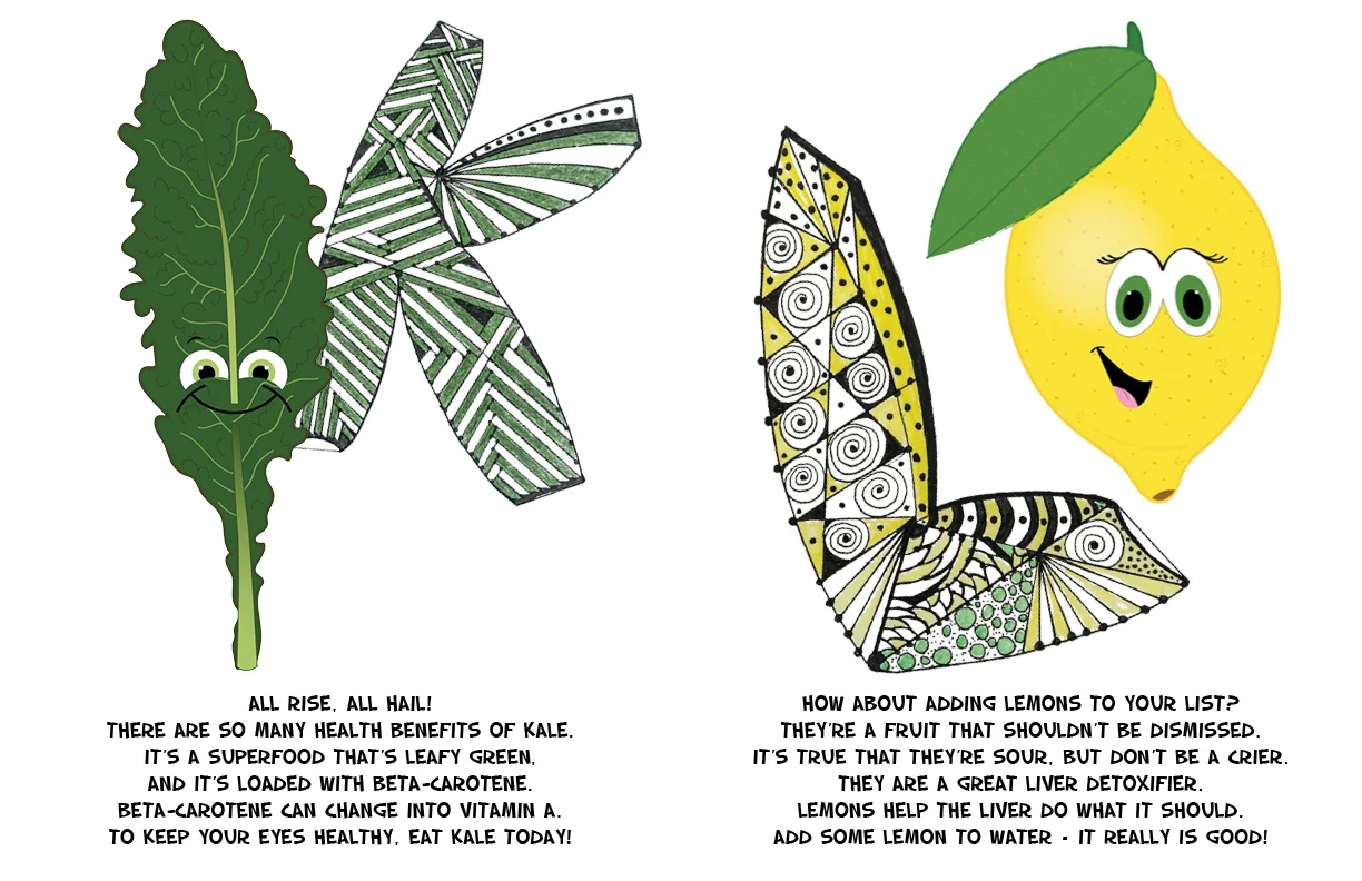 This story showcases different fruits and vegetables that you do not normally hear about! Lisa's mother, Carolyn Szczepanski did the letter illustrations and I developed all of the characters.